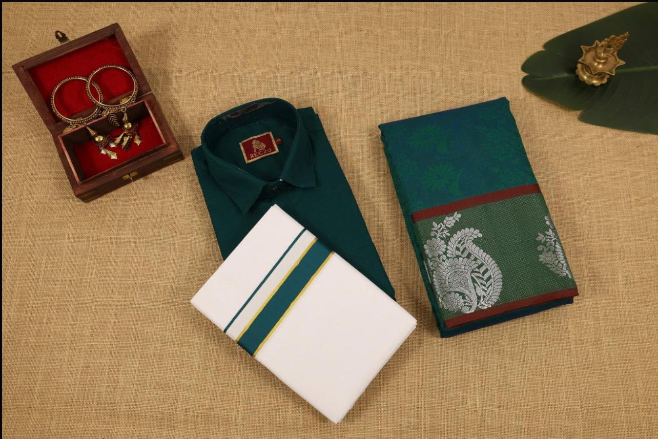 BrandyElevate your traditional look with the Utsav Silk Classic Combo from Sree’s Silks, crafted for men who value elegance and cultural pride. This premium set features a rich emerald green shirt paired with a classic white veshti, finished with a refined green and gold border that reflects timeless South Indian tradition.
